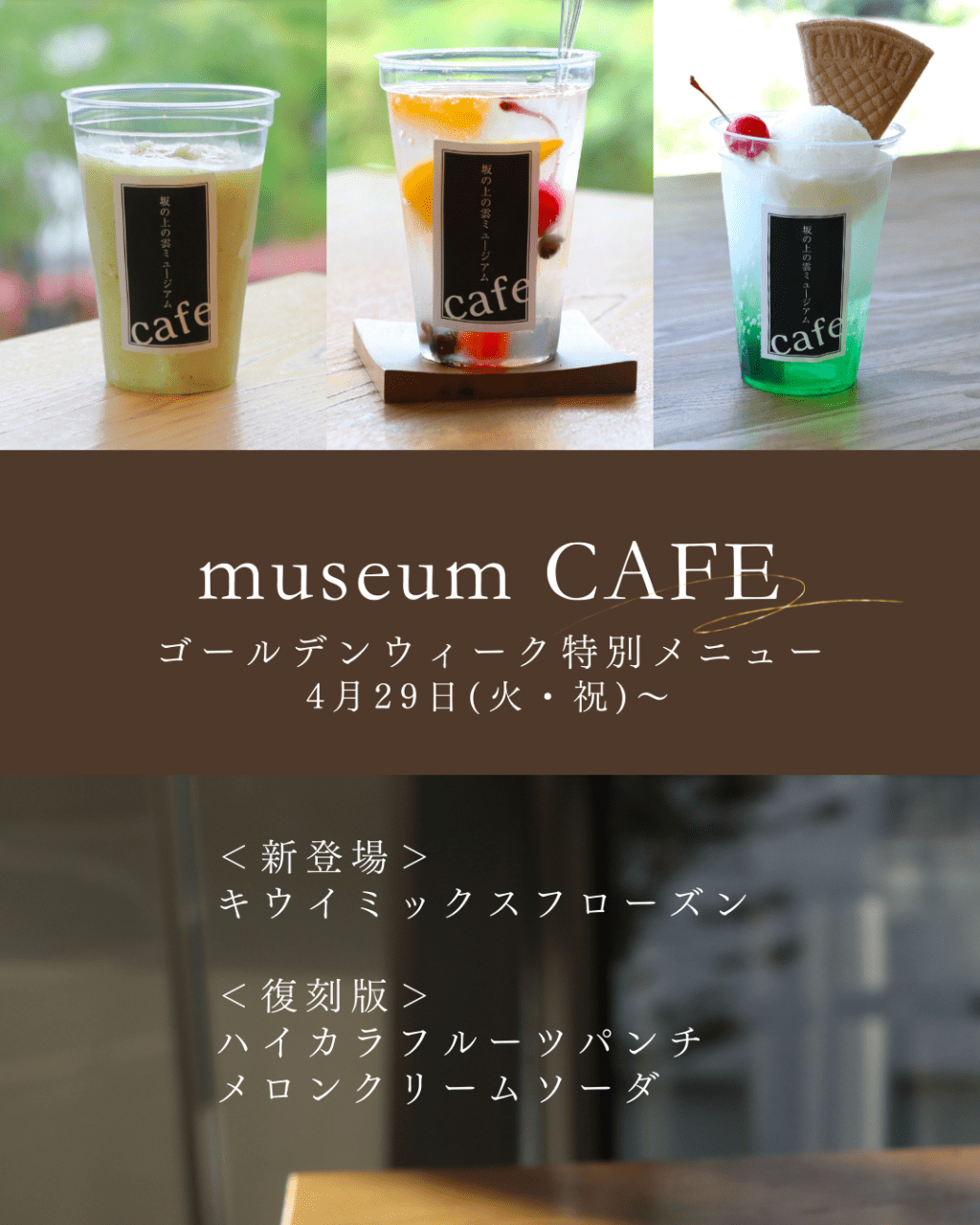4月29日(火・祝)から、新登場する「キウイミックスフローズン」をはじめ、復刻版メニューも登場!この機会にぜひミュージアムカフェもお気軽にご利用ください。
