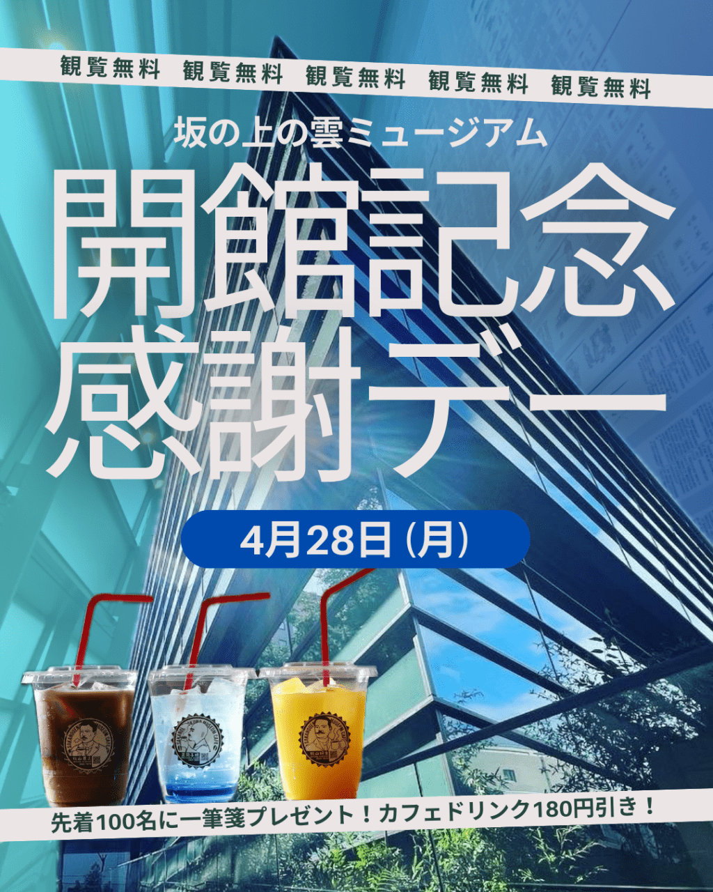 ミュージアムは2007年4月28日にオープンし、今年で開館18周年を迎えます。この特別な日は、なんと展示室の観覧料が終日無料!!また、先着100名様に記念品(一筆箋)をプレゼントするほか、ミュージアムカフェの500円ドリンクが180円割引になります!