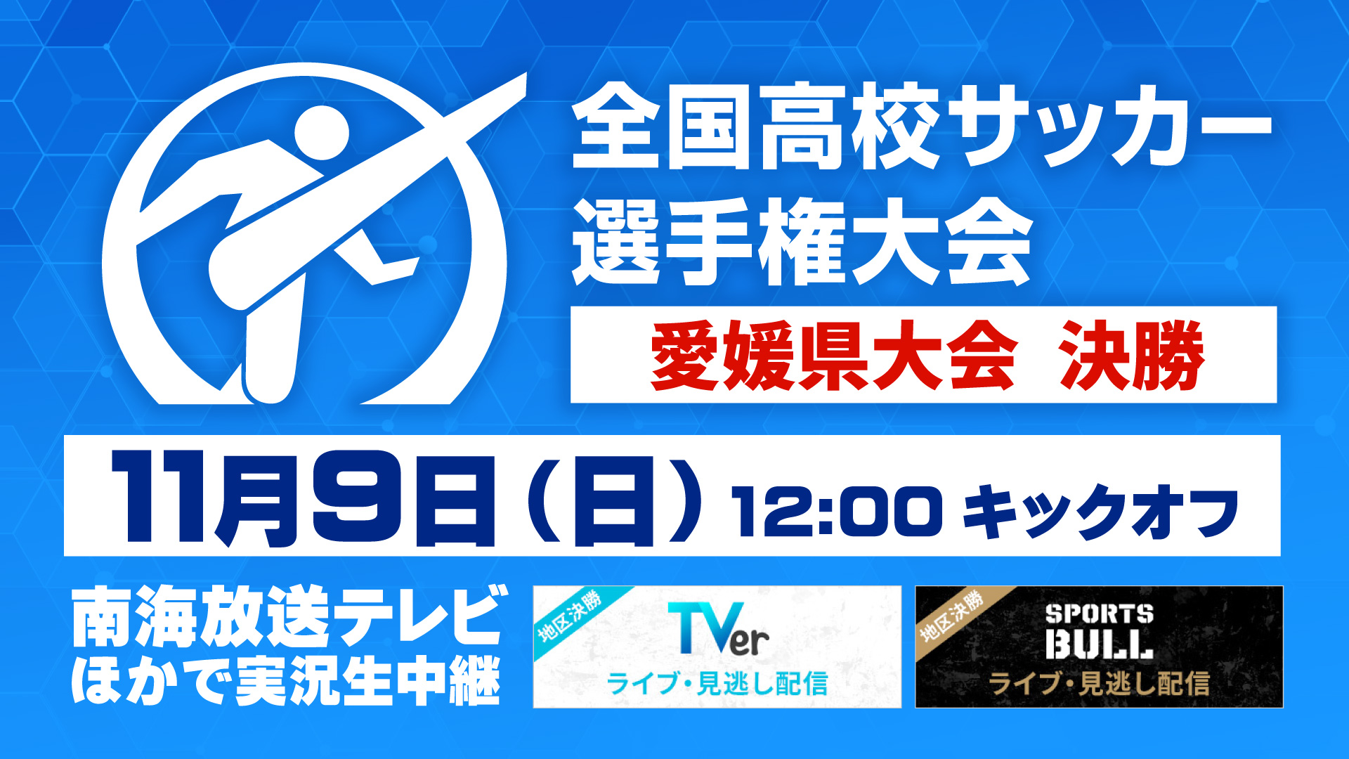HOME > お知らせ > 愛媛県大会 決勝 南海放送テレビほかで実況生中継! 2025/11/05 愛媛県大会 決勝 帝京第五 vs 新田 11月9日(日)12:00キックオフ(ニンジニアスタジアム) 南海放送テレビ(11:45~)、TVer(12:00~)、スポーツブル(12:00~)で実況生中継! -お知らせ