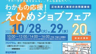 愛媛労働局 【愛媛労働局】「その一歩が未来を変える」、そんなあなたへ…。わかもの応援!えひめジョブフェアを開催します ■日時 10月28日(火)、10月29日(水)10:00~12:00、14:00~16:00■場所 松山市公共職業安定所 3階 大会議室 (松山市六軒家町3-27)■内容 参加企業は20社(5社×4部:入れ替え制)を予定してい... 2025.10.07 愛媛労働局