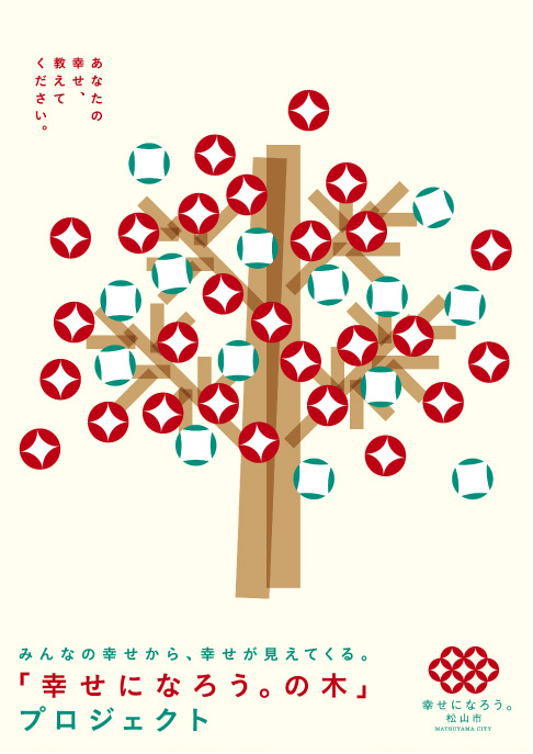 皆さんが感じる幸せをカードに記入して、「幸せになろう。の木」につるし、「松山で暮らすみんなの幸せ」を見たり、シェアしたりします。