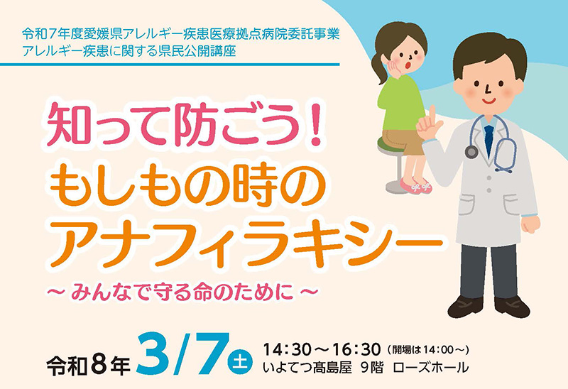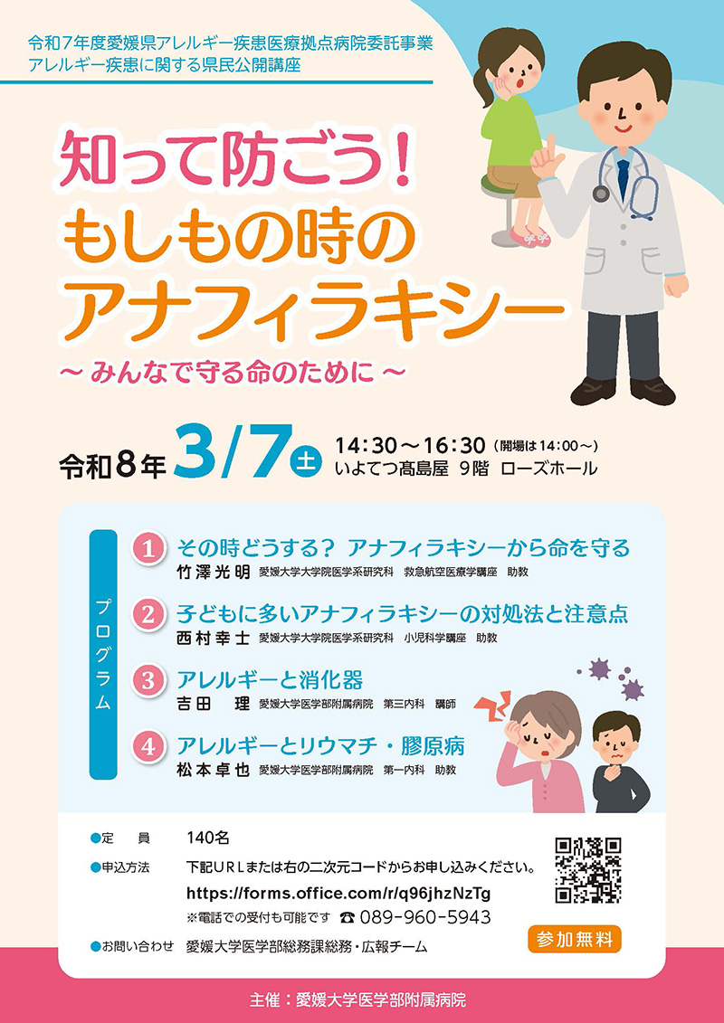 愛媛大学医学部附属病院では、令和8年3月7日(土)に、アナフィラキシーとリウマチに関する県民公開講座を開催します。