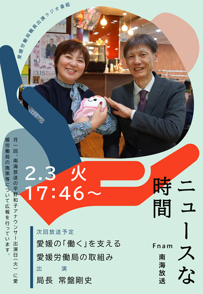 愛媛労働局では毎月一度、南海放送ラジオ番組「ニュースな時間」において、労働行政に関する最新情報や取組み状況をお届けしています。