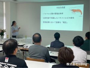 藤原)いくつかポイントはありまして、一つ目はやっぱり安定供給と高い生存率っていうことですね。私が今提唱しているやり方っていうのは、水温や水質をですね、屋内で24時間管理して育てるんですね。屋内で育てますので、病原菌とか雨水が入るわけでもないですので、そういうリスクが低いんですね。いわゆる病気になってエビが死んでしまうようなリスクが少ない、っていう意味があります。で、屋内で管理されて作りますので高品質なエビが育つと。そういったポイントですね。あと海外の養殖っていうのはマングローブを切り開いて、SDGsの観点でいうとちょっとずれてるんですよね。そういう意味では、我々が提唱してる陸上養殖というのは、海水をほとんど排出しない循環式のシステムのために、周辺環境への汚染の心配とかがないんですよね。そういう点で一つポイントになります。