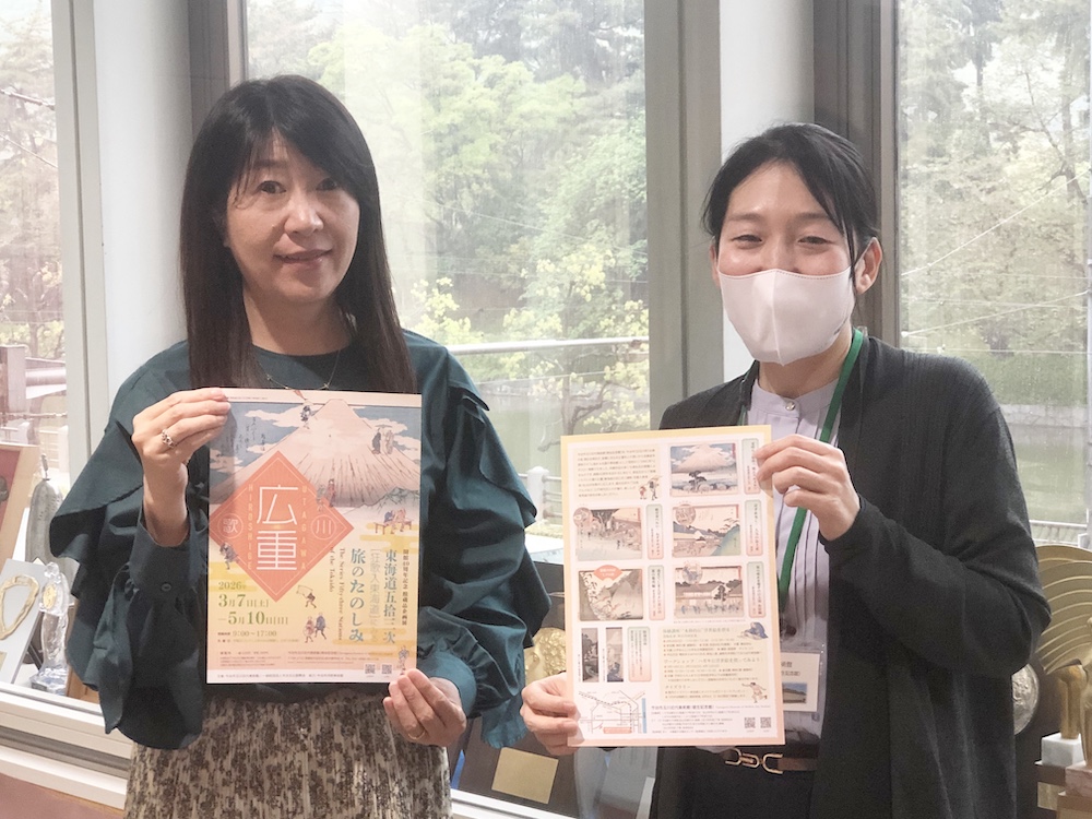 今週、坂の上に訪ねてきてくださったのは、今治市玉川近代美術館学芸員の藤原敏子さん。現在、開館40周年記念として「東海道五拾三次 狂歌入り 東海道にみる旅のたのしみ」が開催されています。東海道五拾三次といっても、じつは56点あり、それが全てそろっている美術館というのは愛媛では玉川近代美術館だけ!全国でも珍しいそうです。所蔵されていても一堂に見られるのは貴重な機会とのこと。そこで「歌川広重と東海道五拾三次」をテーマに、「広重ブルー」「旅の醍醐味、食にお土産」「広重が描いた石鎚山」をキーワードに、作品の魅力を掘り下げていただきました!